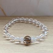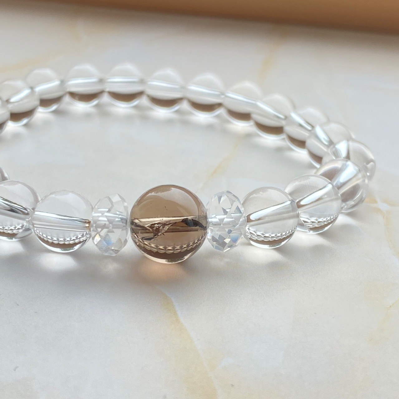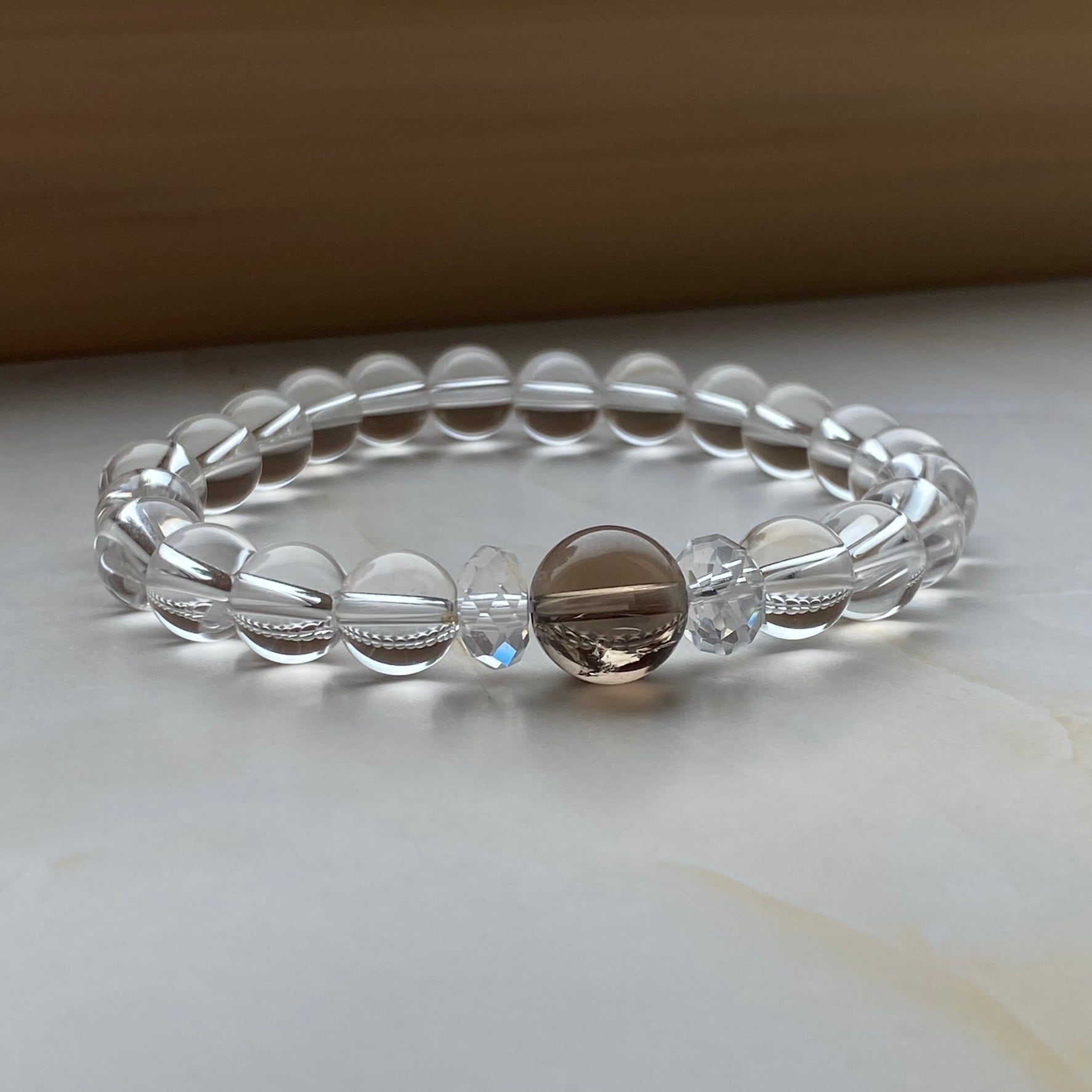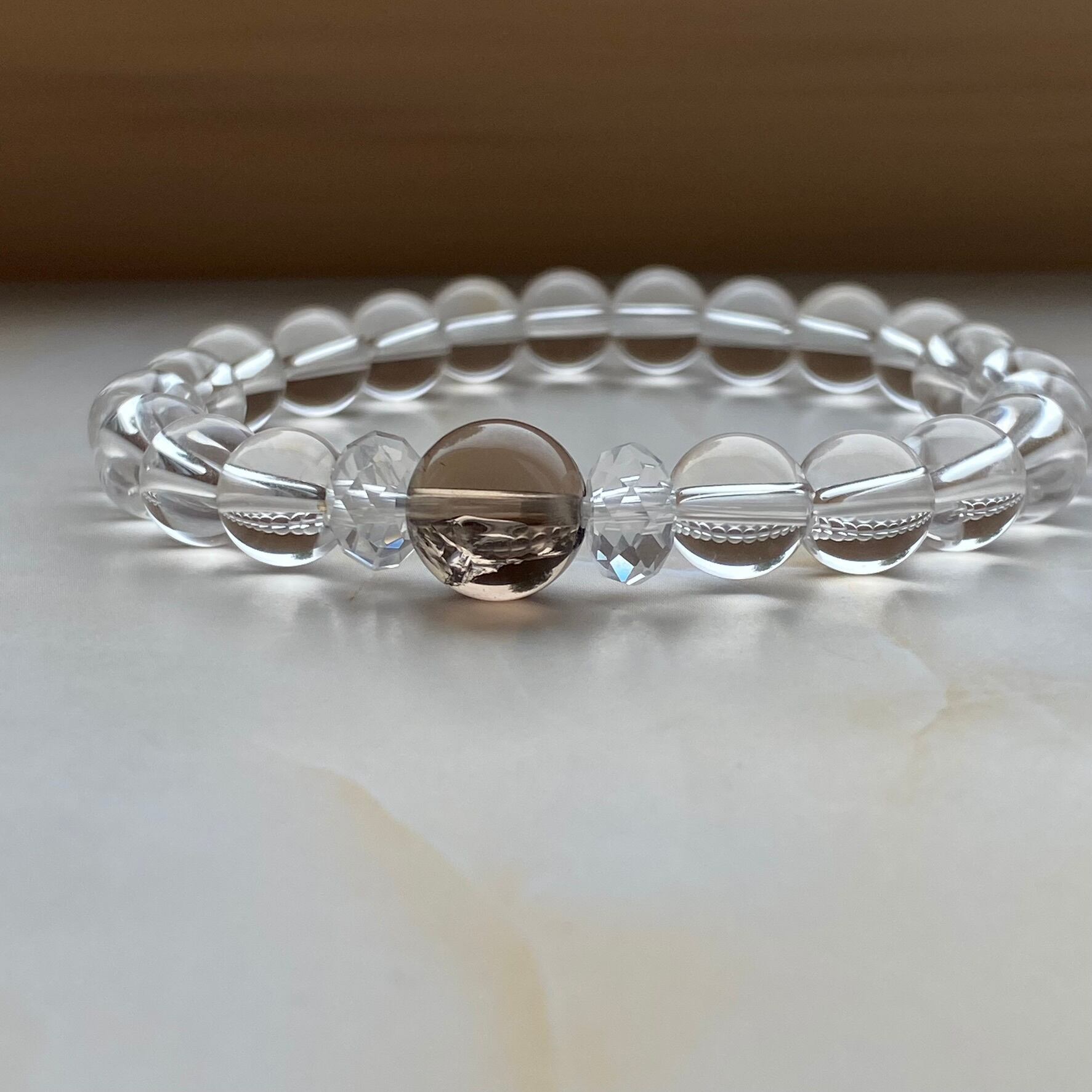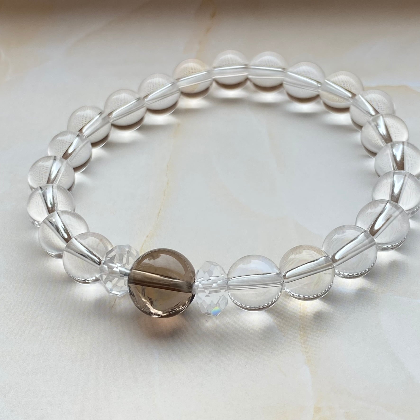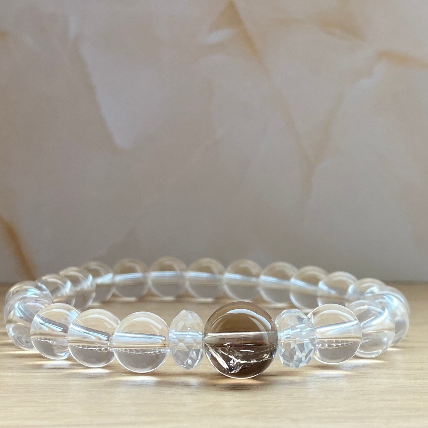 この【水晶・アイリススモーキークォーツ ブレスレット】は、透明感のある8㎜のラウンド水晶に、一粒のアイリススモーキークォーツがアクセントとして際立つ、シンプルでありながら洗練されたデザインのブレスレットです。