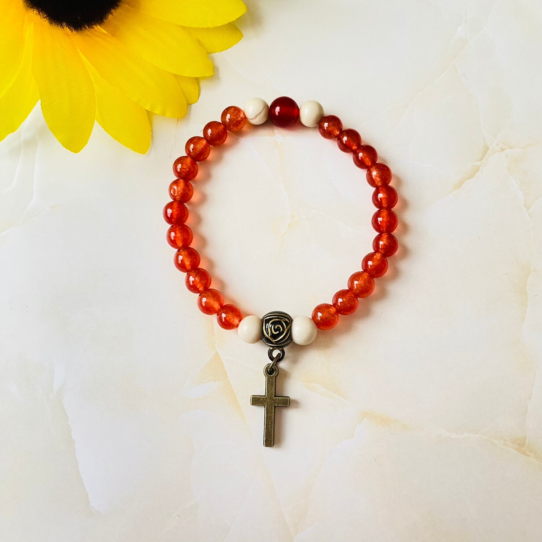 レッドカラージェードとリバーストーンの組み合わせが愛らしい、クロスチャーム付きのブレスレットです。