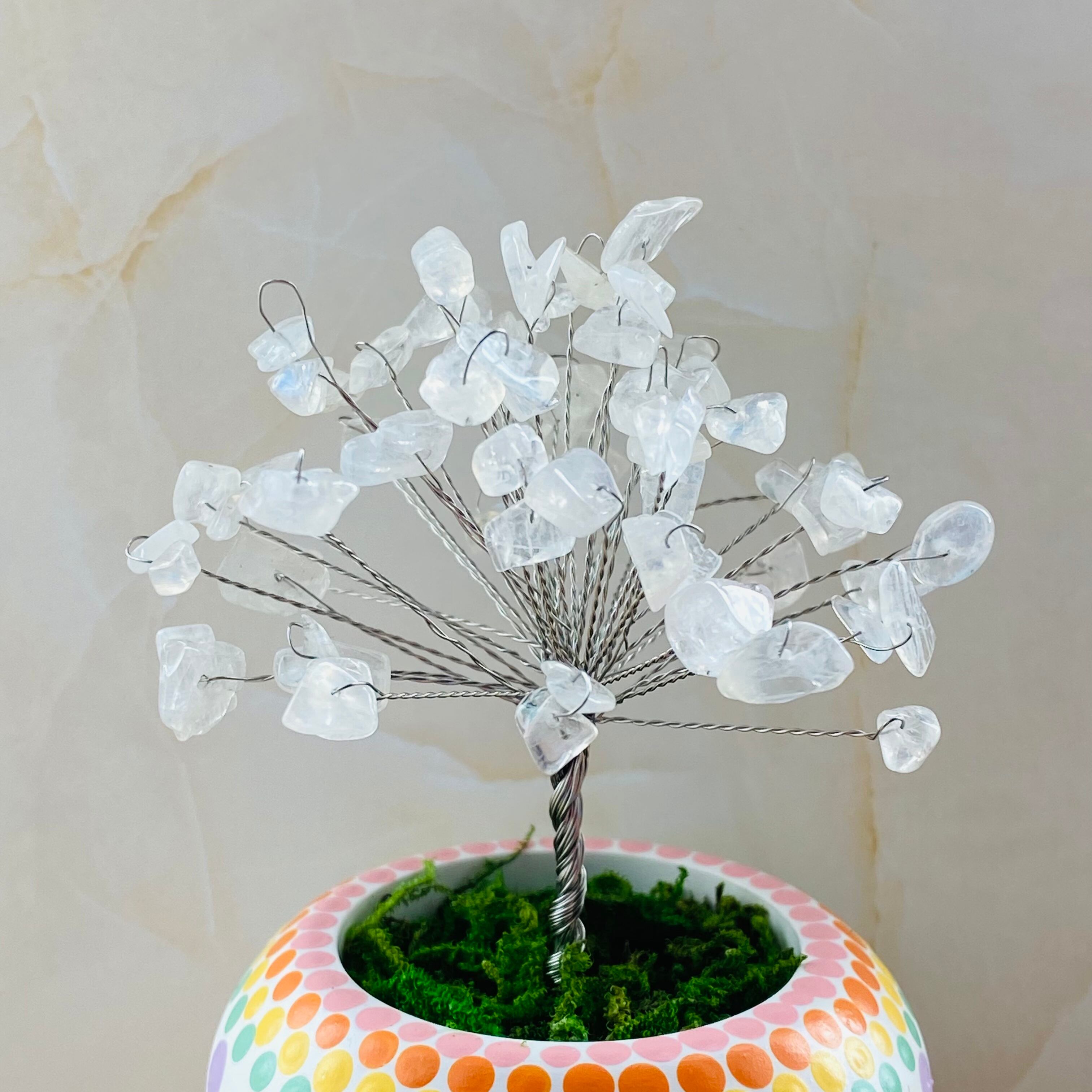 このツリーは、角度によりシラーの輝きが見られるレインボームーンストーンで出来ています。
