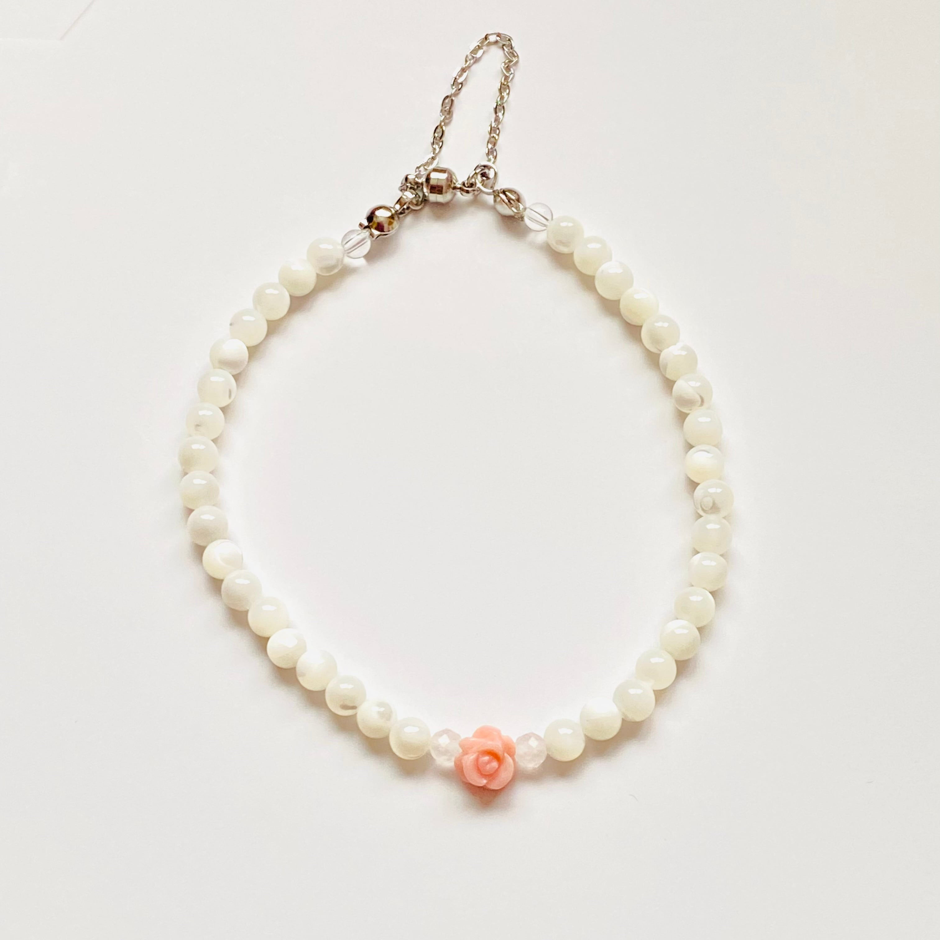 薔薇のモチーフはバハマ産のクィーンコンクシェルという美しい貝殻から作られており、可愛らしいピンク色がワンポイントとして魅力を発揮しています。