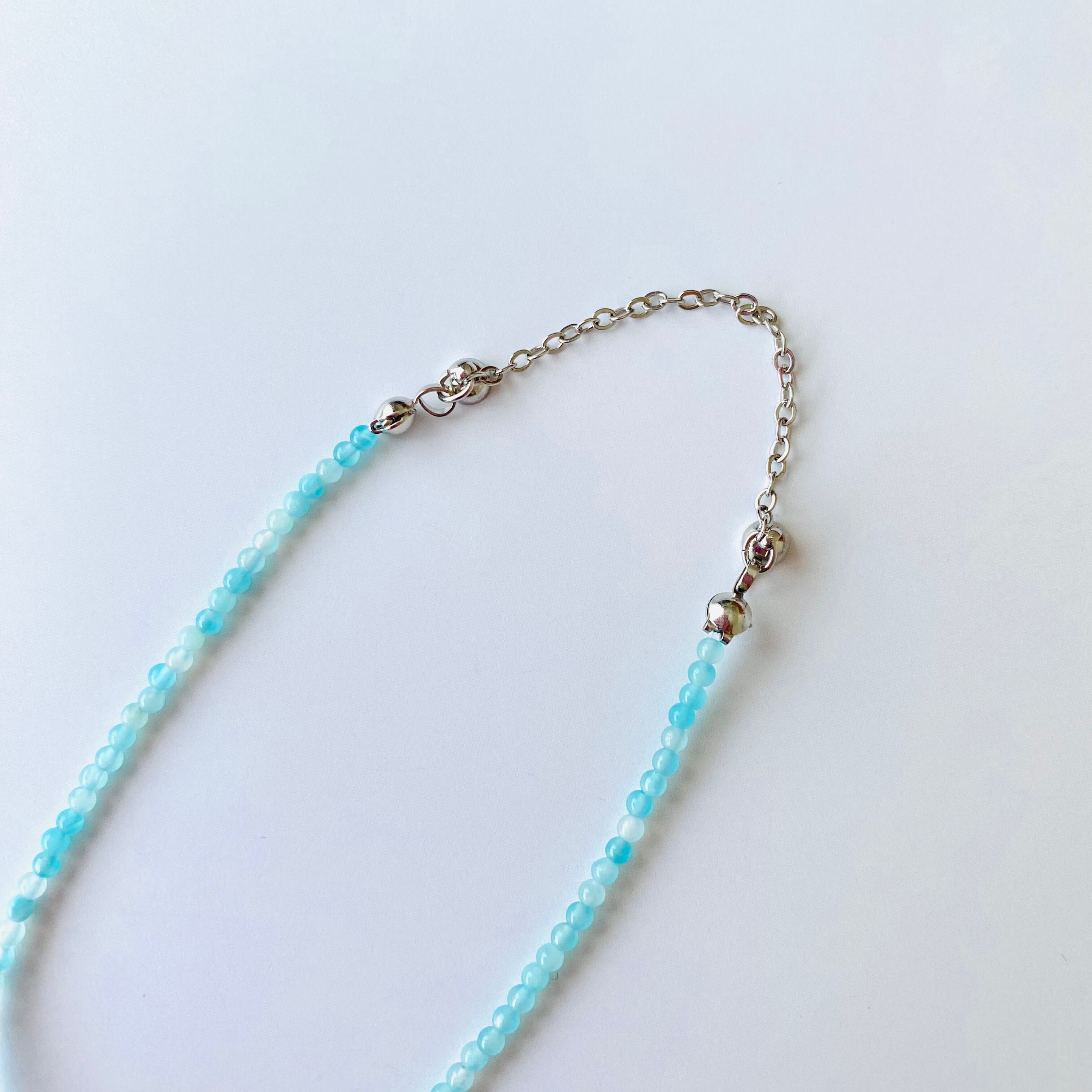 美しい淡いブルーが特徴的な天然石アマゾナイトシリカの2mmを使用し、華奢でシンプルなデザインに仕上げました。マグネット留めなので、着脱も簡単です。身につけるだけで、リラックス効果を感じられます。