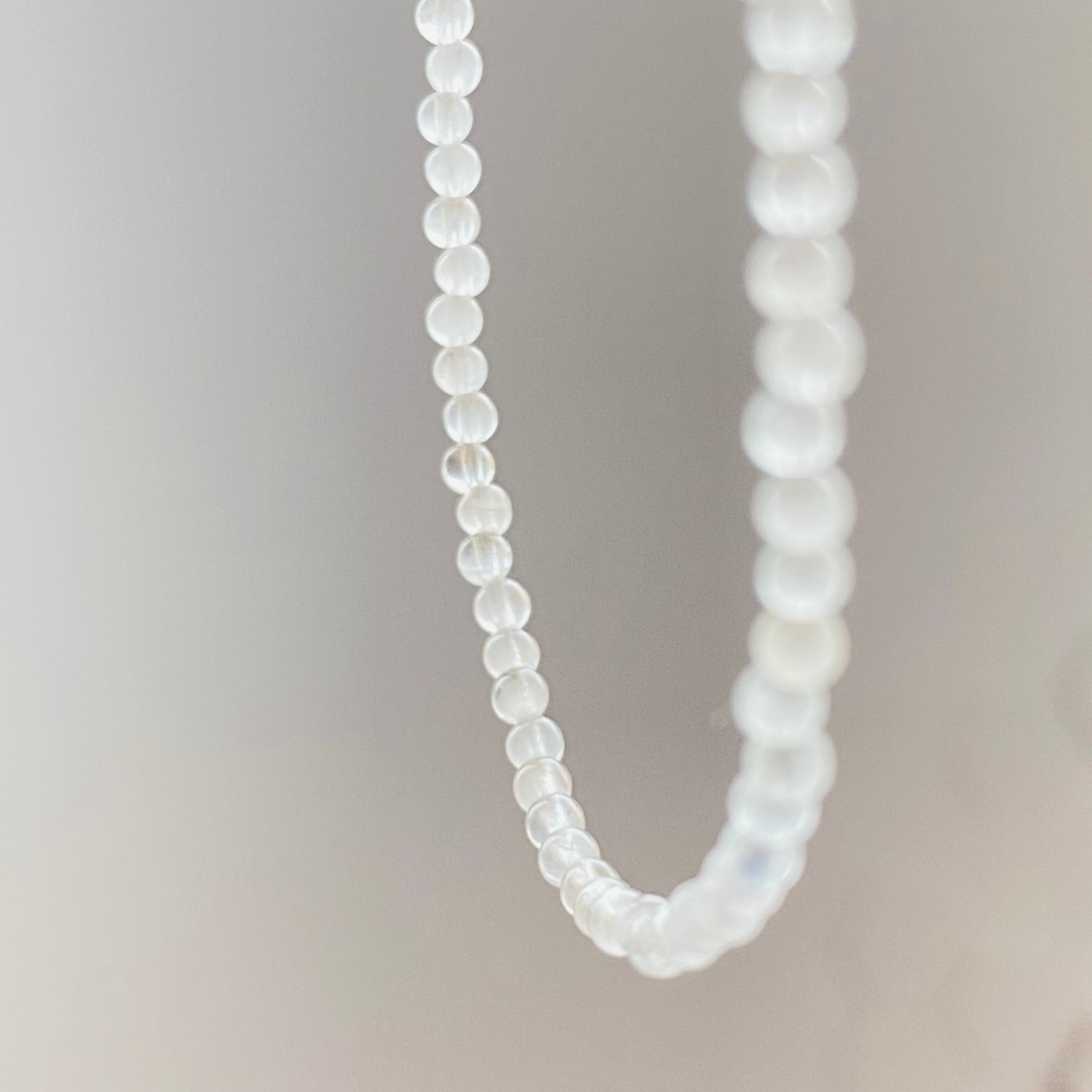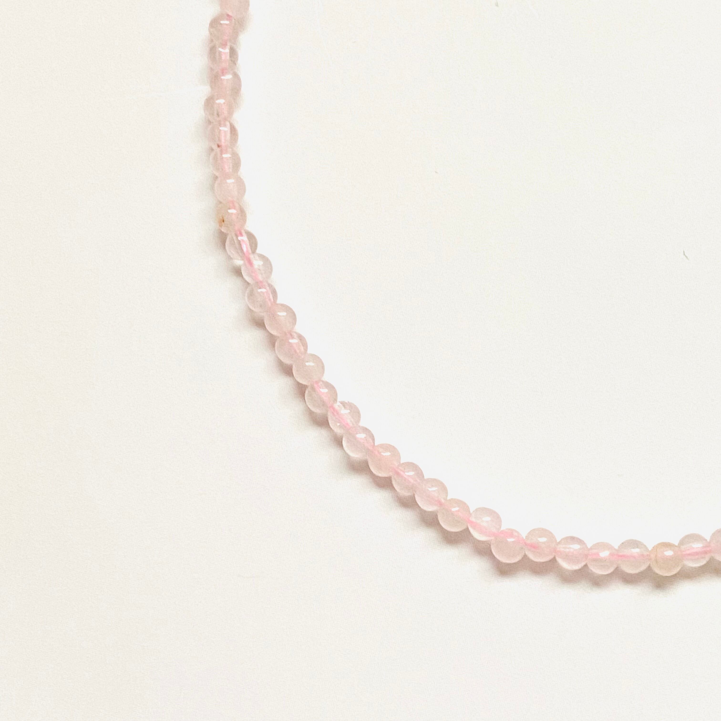 このブレスレットには、天然石のローズクォーツを使用し、2mmという細い粒を丁寧に連ねました。マグネット式の留め具なので、簡単に装着・脱着ができ、使い勝手も抜群です。