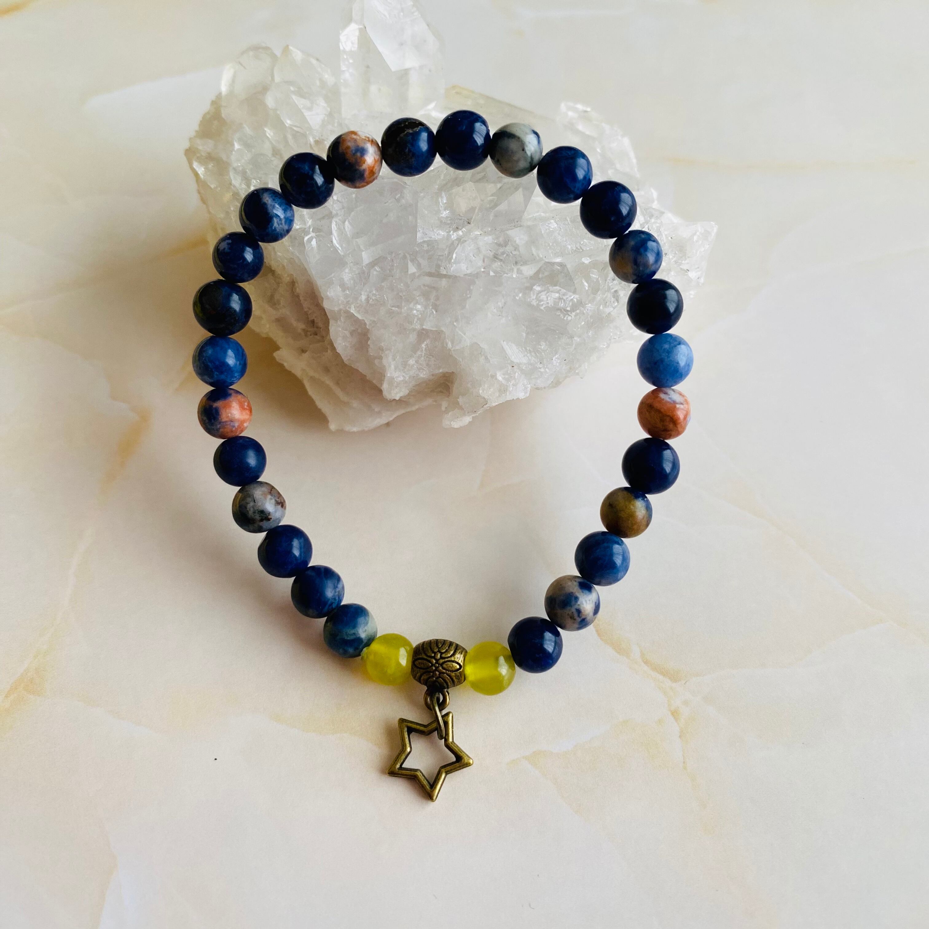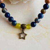 星の輝きを身にまといたいあなたへ、星チャーム付きの特別なブレスレットをご紹介します。天然石の中でも人気の高いレッドラインソーダライトと、オリーブカラーのジェードを組み合わせ、仕上げました。
