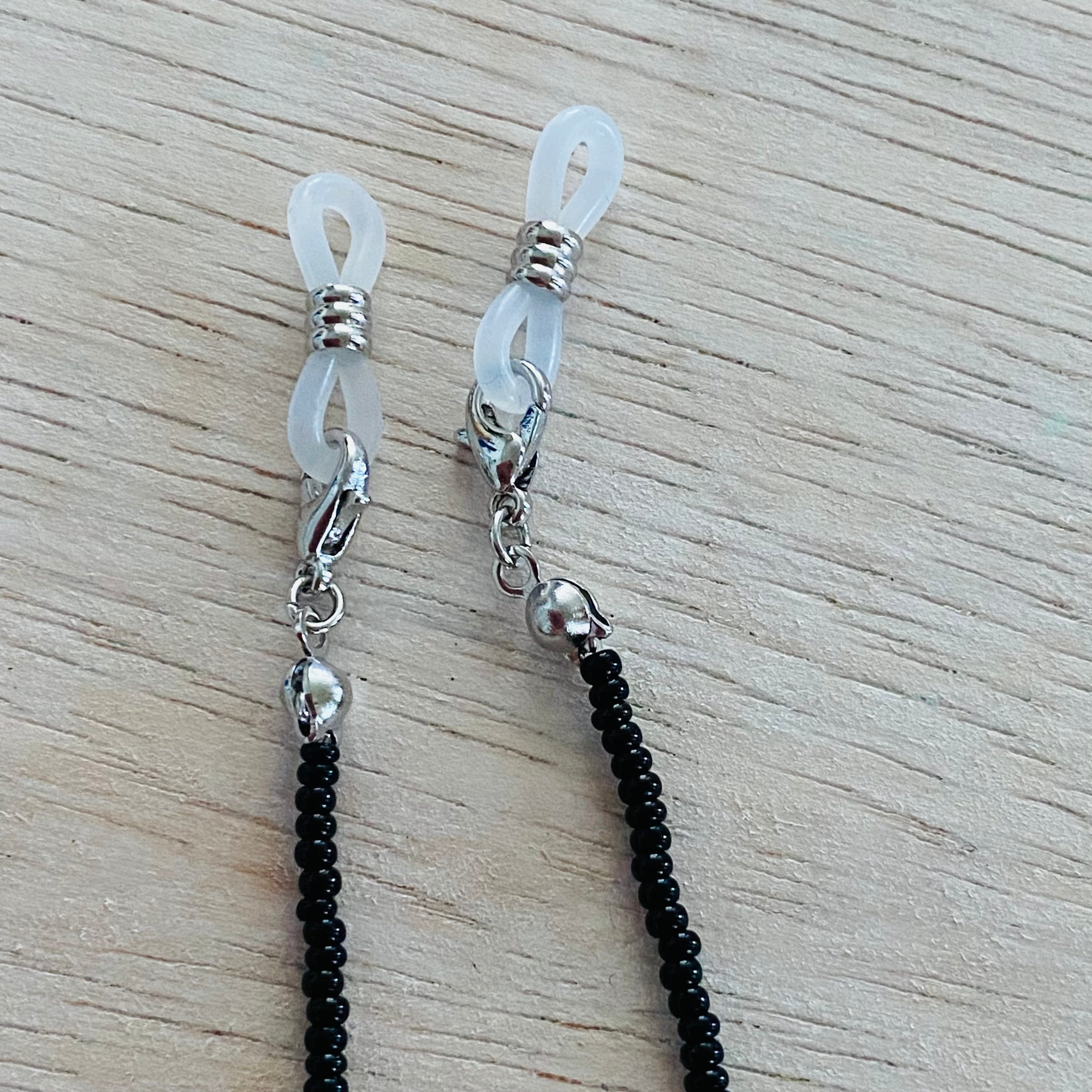 グラスコード(眼鏡チェーン)水晶・ブラックは、一見シンプルなブラックビーズに、天然水晶とベビーピンクのビーズが華やかさを添え、お洒落なアイテムをよりクラスアップします。